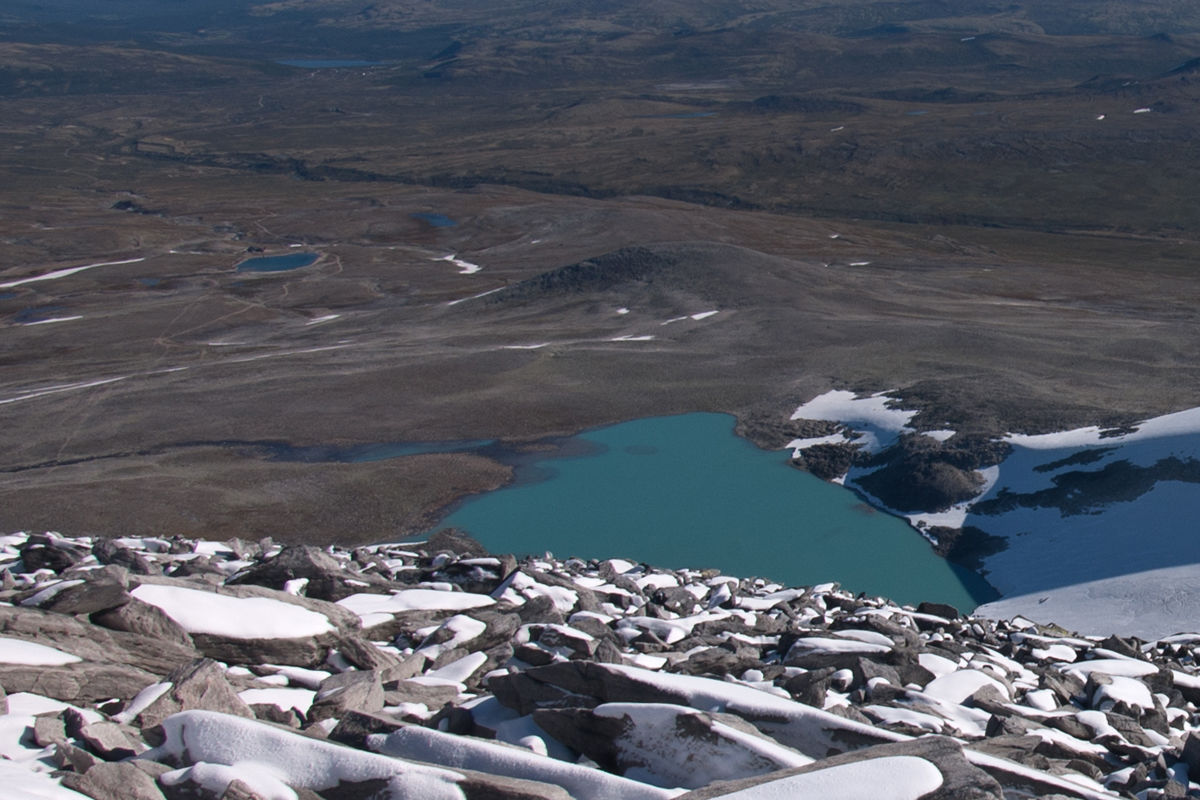 Vannet i innsjøen ved Snøheim kommer via Stridåtjørnin fra Istjørni, som ligger ved enden av isbreen inne i Snøhetta-massivet. Sedimentene du nettopp så, har fulgt med elven hele veien nedover.