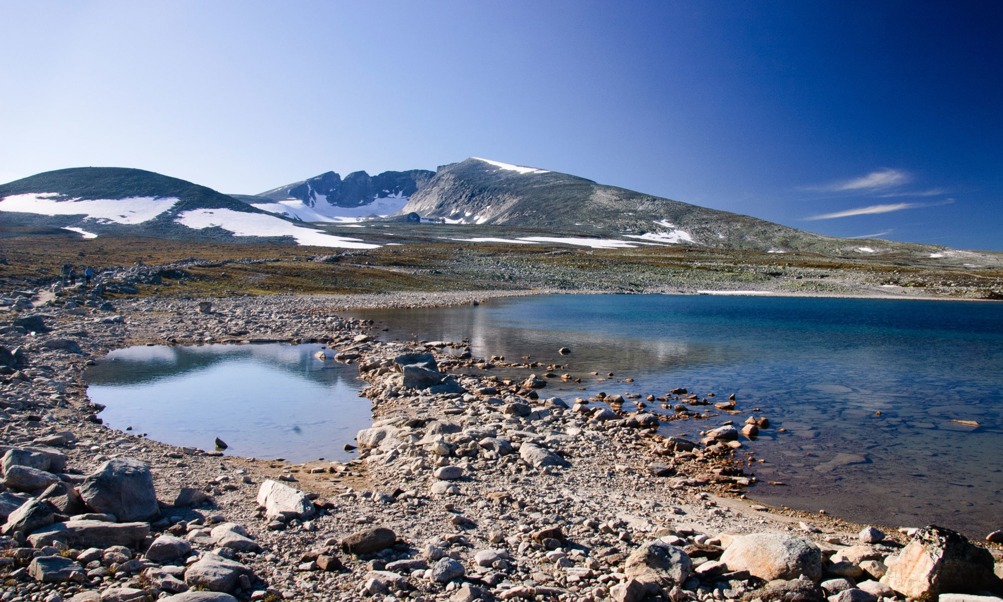 Start ved Snøheim og følg stien på sørsiden av den lille innsjøen foran hytten. Hvis du stopper der hvor stien går akkurat ved vannet, vil du se at steinene er dekket av et finmalt pulver. Slike ørsmå steinpartikler – sedimenter – dekker hele bunnen av innsjøen. De eldste sedimentene har ligget der i 11 000 år, og det fylles stadig på med nye.