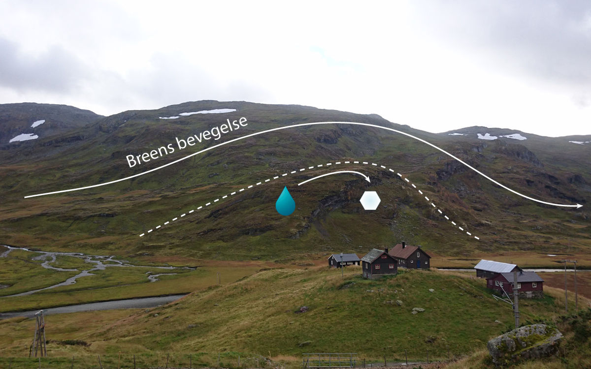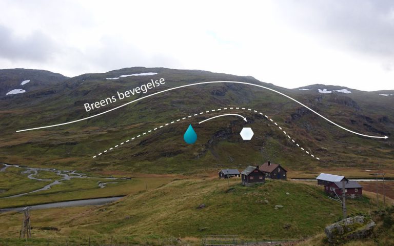 Kanskje føles det bratt, men som du så fra veien, er dette den slake siden av Trettehaugen. Gå til toppen og sammenlign de to skråningene. Da Upsetedalen var dekket av isbreer, gled de sakte nedover i retning Voss. Når breene møtte en hindring, som Trettehaugen, strømmet de rett over. I skråningen du nettopp gikk opp, ble trykket så høyt at is smeltet. Smeltevannet rant over Trettehaugen og frøs til is igjen på lesiden, der det var mindre trykk.