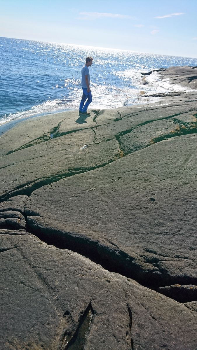 Mens du står på rullesteinstranden kan kikke mot vest på klippene på andre siden av bukten. Klippene er del av en landform kalt ’rundsva’ og kan brukes til å rekonstruere hvilken retning isen gikk. Rundsvaene er avlange og avrundet på nordsiden (støtsiden) og bratt og kantet på sørsiden (lesiden), ikke ulikt en hvalskrott skylt i land. Isen som strømmet over her hadde et stort trykk på nordsiden (les: støtside) som gjorde at den smeltet på undersiden. Dette smeltevannet presset seg frem og da det nådde le siden frøs det til is inne i sprekker i fjellet som følge av lavere trykk. Vann tar større plass når det fryser og dette fører til at steiner blir sprengt løs fra berggrunnen og blir fraktet videre med isen. Dette kalles plukking, og forklarer hvorfor klippene blir brattere og brattere etterhvert som isen jobber. De kommer i mange former og størrelser og er karakteristiske for denne delen av norskekysten.